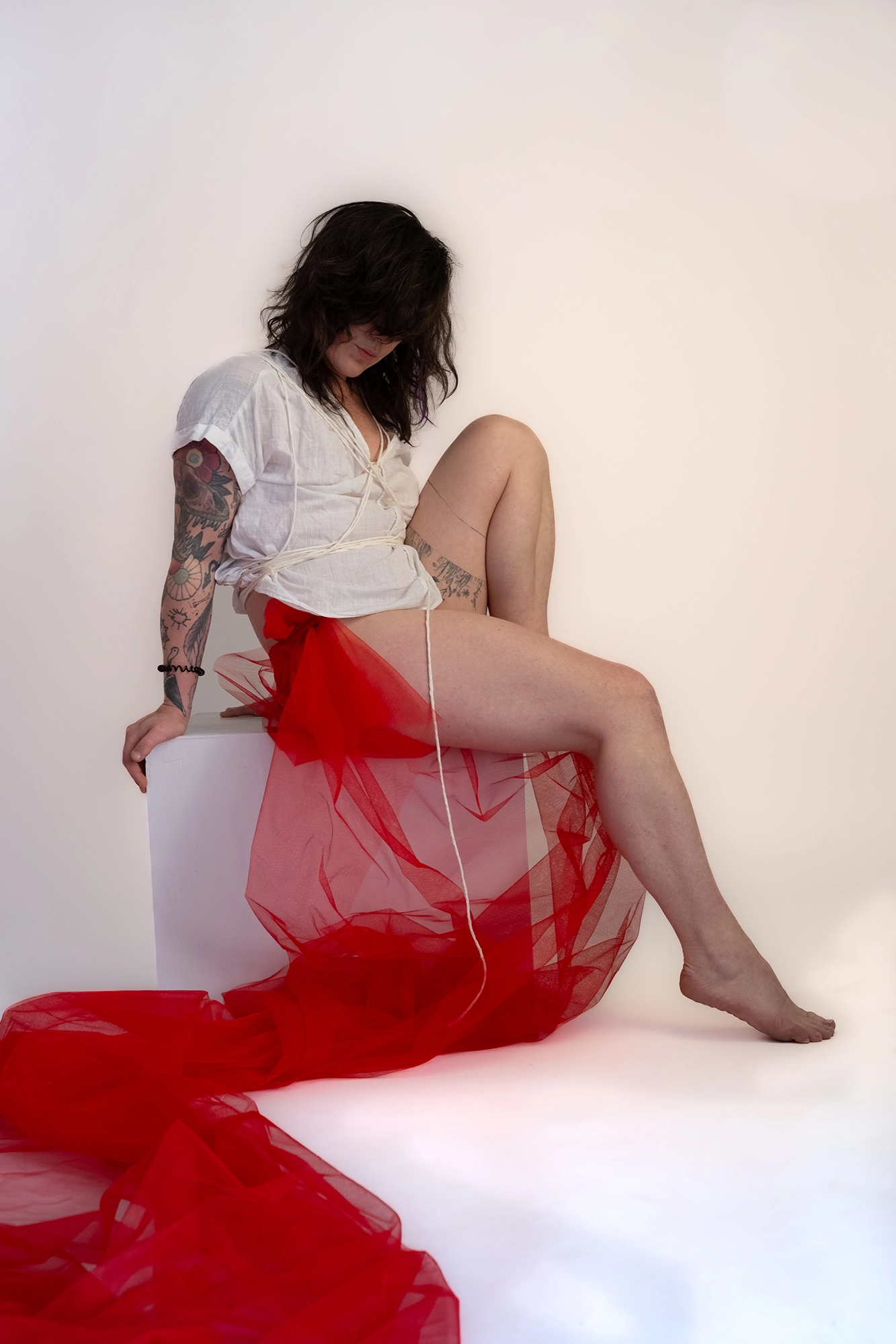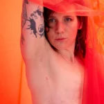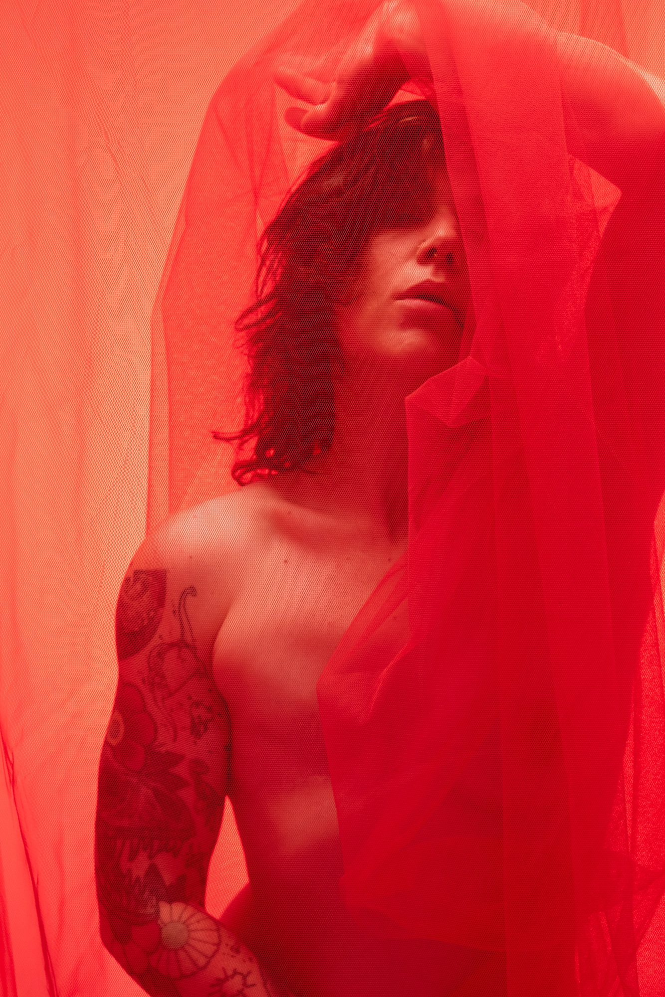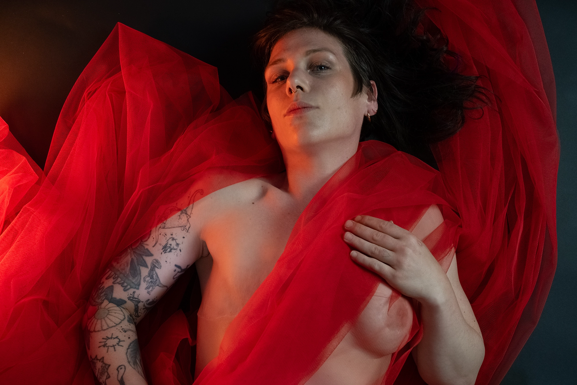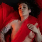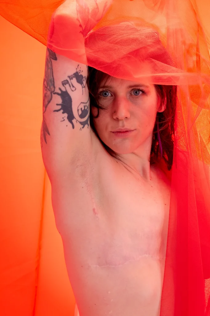 Pia: „Ein weiterer Teil der Arbeit hat mir Angst gemacht. Nicht wegen meiner Narben. Nicht wegen der Kamera. Sondern wegen des Blicks von außen. Roter Tüll, nackte Haut – alles schreit nach Verführung. Weil unser Blick auf Körper gelernt hat: Haut gleich Sex. Brüste gleich Weiblichkeit. Verletzlichkeit gleich Schwäche.