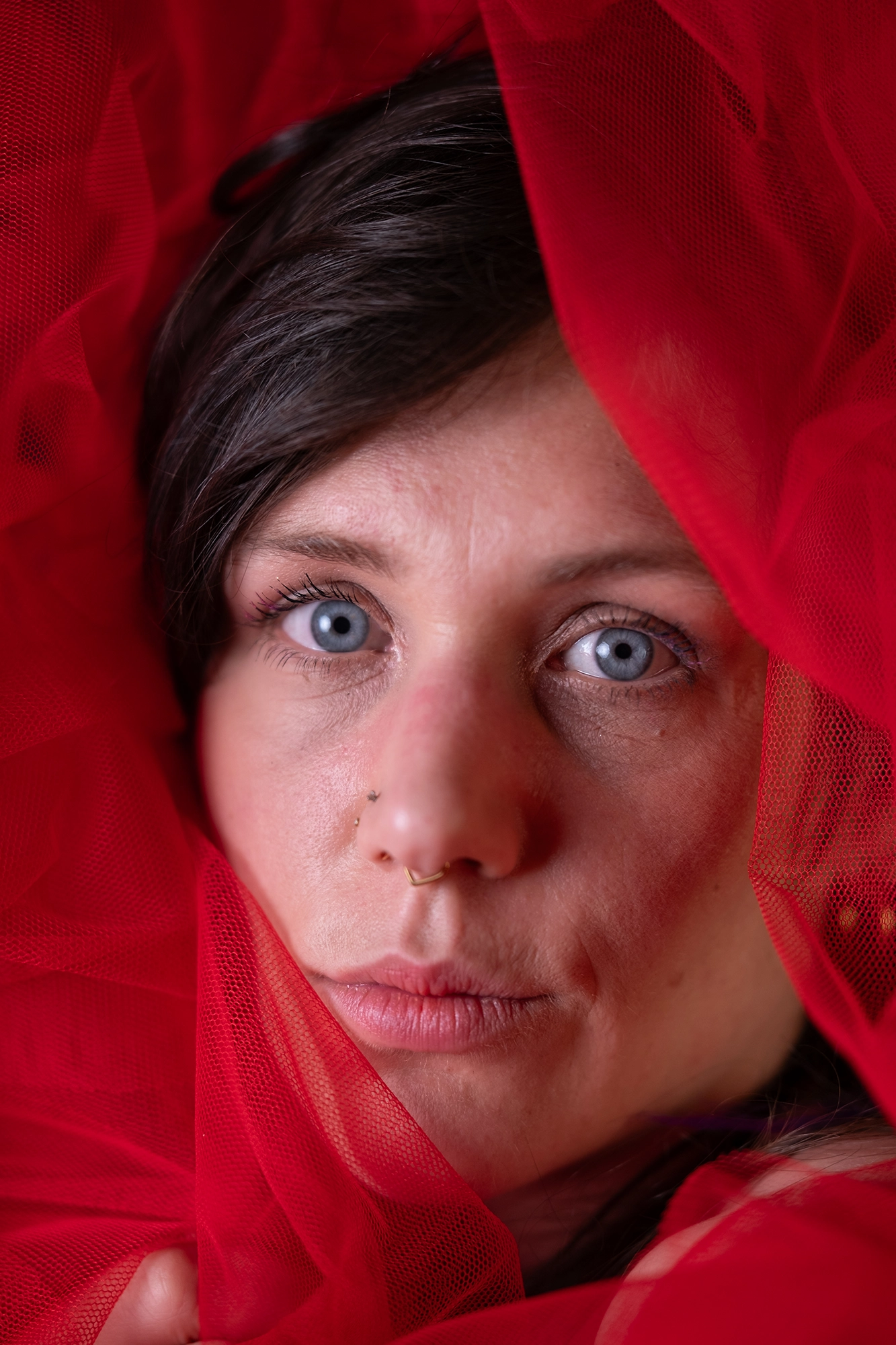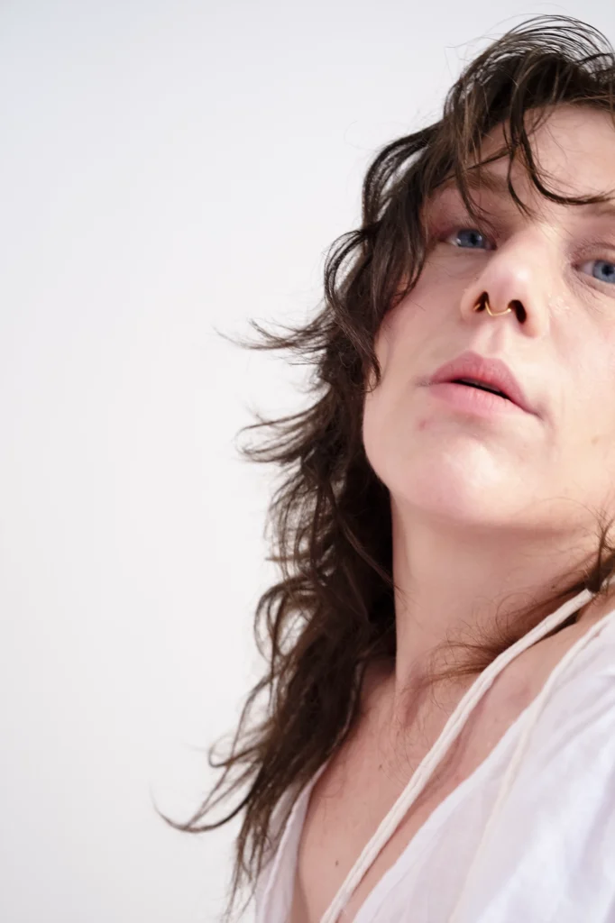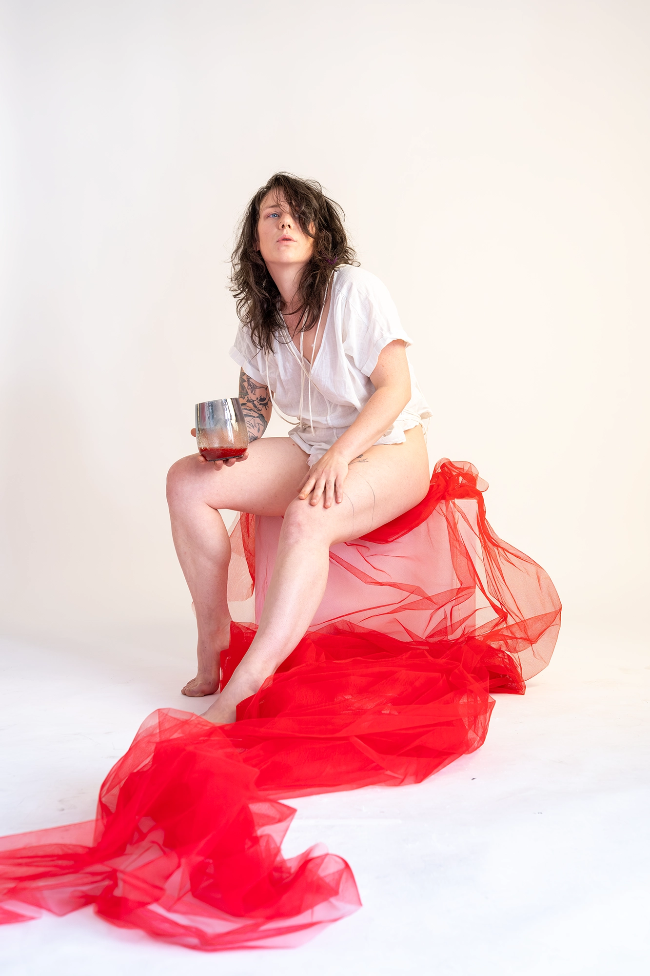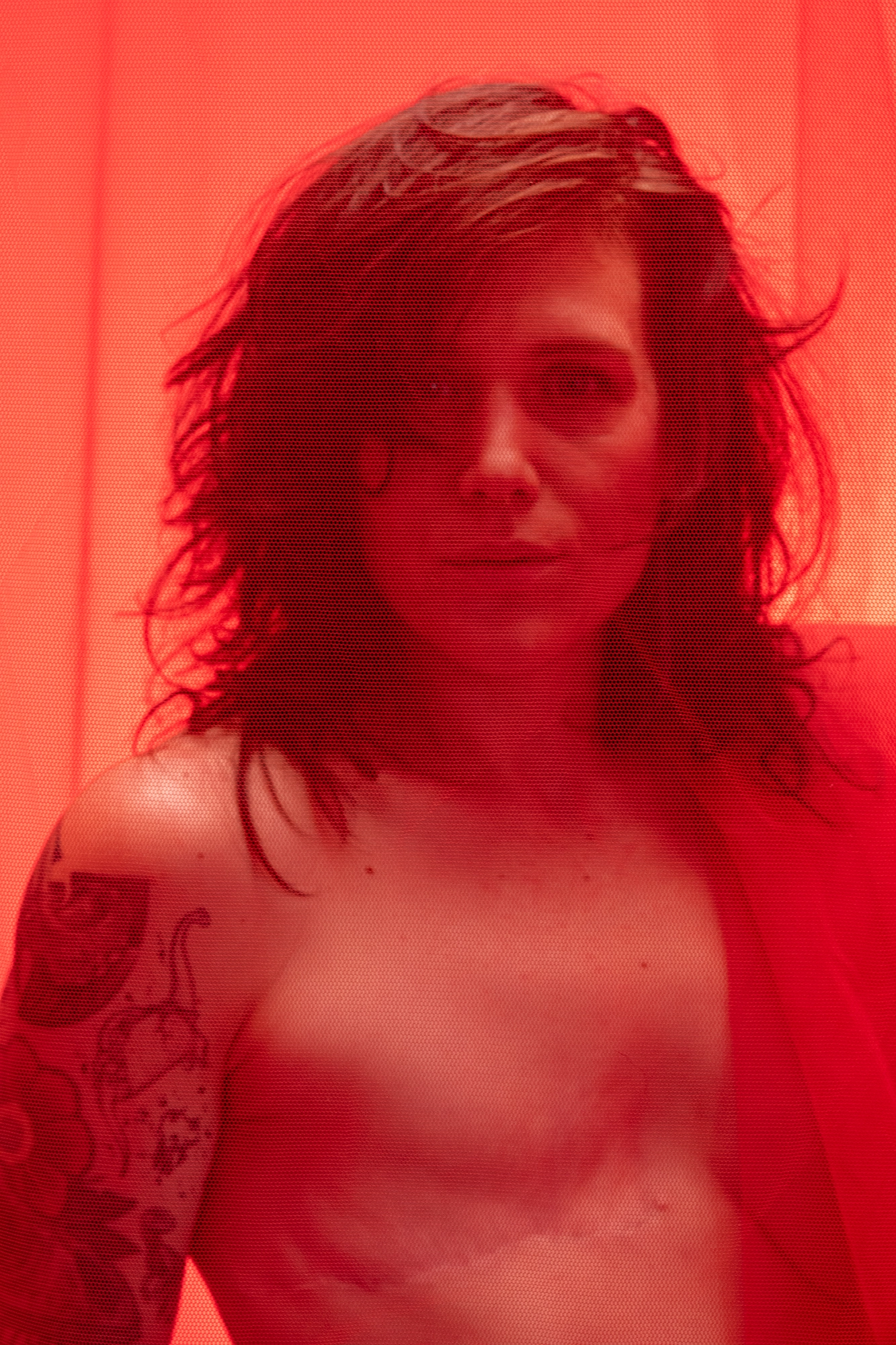 Pia: „Ein weiterer Teil der Arbeit hat mir Angst gemacht. Nicht wegen meiner Narben. Nicht wegen der Kamera. Sondern wegen des Blicks von außen. Roter Tüll, nackte Haut – alles schreit nach Verführung. Weil unser Blick auf Körper gelernt hat: Haut gleich Sex. Brüste gleich Weiblichkeit. Verletzlichkeit gleich Schwäche.